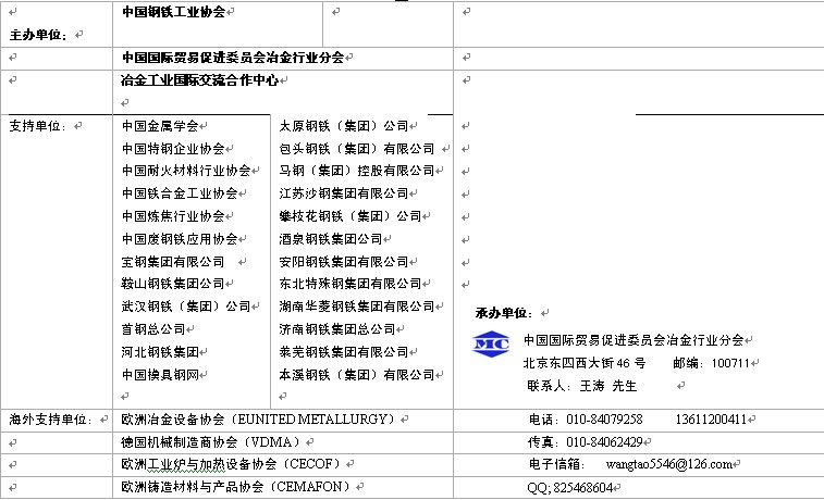 各有關(guān)單位: 經(jīng)國(guó)家有關(guān)部門(mén)批準(zhǔn),由中國(guó)鋼鐵工業(yè)協(xié)會(huì),中國(guó)貿(mào)促會(huì)冶金行業(yè)分會(huì),冶金工業(yè)國(guó)際交流合作中心共同主辦的“2013年中國(guó)(蘇州)國(guó)際冶金工業(yè)展覽會(huì)”將于2013年4月9-11日在蘇州國(guó)際博覽中心舉辦,兩年一屆。 展會(huì)將充分利用蘇州地處長(zhǎng)江三角核心區(qū)的區(qū)域優(yōu)勢(shì),輻射整個(gè)中國(guó)經(jīng)濟(jì)最具活力,產(chǎn)業(yè)基礎(chǔ)最雄厚,冶金原料、技術(shù)設(shè)備和產(chǎn)品消費(fèi)最旺盛的華東地區(qū),為全球冶金行業(yè)搭建一個(gè)展示實(shí)力,交流經(jīng)驗(yàn),洽談合作的平臺(tái)。 展會(huì)的核心展出內(nèi)容包括:冶金技術(shù)、設(shè)備;冶金原料、燃料及輔助材料生產(chǎn)、處理技術(shù)設(shè)備及產(chǎn)品;冶金熱處理、加熱及工業(yè)爐窯;冶金工廠備品、備件生產(chǎn)技術(shù)設(shè)備和產(chǎn)品應(yīng)用;冶金工廠電氣、自動(dòng)化、設(shè)備維檢、安全生產(chǎn)和勞動(dòng)保護(hù)技術(shù)設(shè)備及產(chǎn)品;鋼鐵深加工技術(shù)設(shè)備及產(chǎn)品展示和交易;冶金環(huán)保技術(shù)設(shè)備;廢舊金屬回收、儲(chǔ)運(yùn)及加工應(yīng)用技術(shù)設(shè)備等。 附件一:參展細(xì)則 準(zhǔn)備參展的廠商請(qǐng)?jiān)敿?xì)填寫(xiě)《參展申請(qǐng)表》(合同書(shū)),由單位負(fù)責(zé)人簽字并加蓋公章后傳真或郵寄至展會(huì)承辦單位: 中國(guó)貿(mào)促會(huì)冶金行業(yè)分會(huì)展覽部 地址:北京東四西大街46號(hào)      郵編:100711 電話:010-8479258              傳真;010-84062429  E-mail: wangtao5546@126.com     QQ;825468604 聯(lián)系人:王濤先生   13611200411 展位費(fèi)全款到帳后,意味著報(bào)名正式生效,即可向主辦單位提出確認(rèn)展出位置。展位費(fèi)發(fā)票將隨后直接寄給參展單位的聯(lián)系人。 上述款項(xiàng)請(qǐng)匯入如下帳戶: