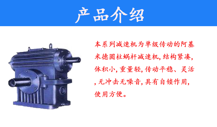 本系列減速機(jī)為單級(jí)傳動(dòng)的阿基米德圓柱蝸桿減速機(jī),結(jié)構(gòu)緊湊,體積小,重量輕,傳動(dòng)平穩(wěn)、靈活,無沖擊無噪音,具有自鎖作用,使用方便。