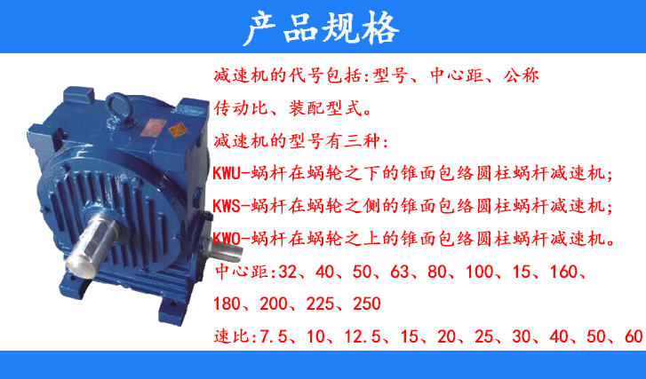其中K-蝸桿為ZK1型,W一蝸桿減速速器,U-蝸桿在蝸輪之下,S-蝸桿在蝸輪之側(cè),O-蝸桿在蝸輪之上。