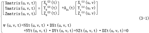 式(3-1)中第一式表示曲面Σ1由坐標(biāo)系S1變換到坐標(biāo)系S2所形成的曲面族,Xmatrix,Ymatrix,Zmatrix分別表示曲面族中各點(diǎn)在x,y,z坐標(biāo)方向上的坐標(biāo)值;第二式中的,NXt,NYt,NZt表示曲面Σ1在點(diǎn)(u,v)對(duì)應(yīng)于t的相對(duì)法矢分量,DXt,DYt,DZt表示點(diǎn)(u,v)運(yùn)動(dòng)軌跡對(duì)應(yīng)于t的相對(duì)切矢分量。