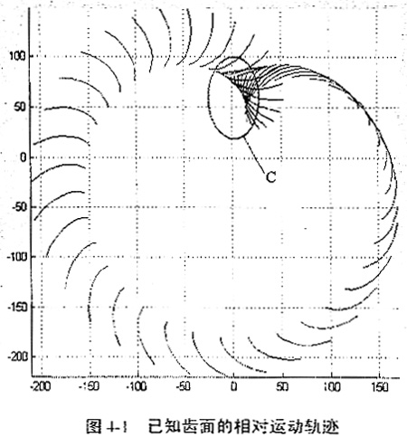 在已知齒輪齒面一個(gè)周期的相對(duì)運(yùn)動(dòng)所留下的運(yùn)動(dòng)軌跡中,我們可以看出,在區(qū)域C中出現(xiàn)了一個(gè)清晰的包絡(luò)面,它就是所求的未知齒面,即兩齒面在C區(qū)嚙合,稱C區(qū)為嚙合區(qū),而在C區(qū)之外,也會(huì)出現(xiàn)包絡(luò),但那只是幾何意義上的共軛點(diǎn),不產(chǎn)生真正意義上的嚙合傳動(dòng);已知齒面在嚙合區(qū)域與非嚙合區(qū)域有較清晰的界限;在嚙合區(qū)域,已知曲面與所求齒面的共軛關(guān)系是簡(jiǎn)單的,無論是否會(huì)出現(xiàn)二次接觸,這一區(qū)域的共軛曲面都可以用數(shù)字化共軛曲面求解方法求出。