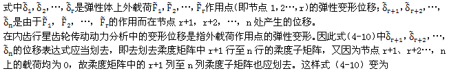 由式(4-1)表達的是彈性體節(jié)點位移的隱函式。必須將其轉換只與彈性體外載荷有關的節(jié)點位移顯函式,才有用于內齒行星齒輪傳動的動力分析中。由于式(4-1)中的總剛度矩陣K是一個奇異矩陣,不存在逆矩陣,所以不能直接解出其位移表達式來。必須考慮實際邊界條件,以及為避免出現(xiàn)剛體運動,對具體的彈性體進行某體節(jié)點零位移的約束處理。即對總剛度矩陣K要作相應的變更,使總剛度矩陣變?yōu)榉瞧娈惥仃。處理邊界位移約束的方法見參考文獻。