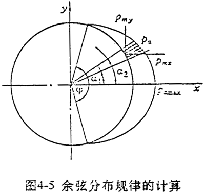 確定作用于結構邊界上的非均布載荷是一件復雜工作,往往需要進行一些較復雜的計算,譬如采用接觸問題有限元法進行計算。在實際應用中常采用一些近似的假設規(guī)律來代替這些復雜的未知分布規(guī)律。對于軸承載荷,一般假設沿周邊按余弦規(guī)律分布如圖4-5所示,即