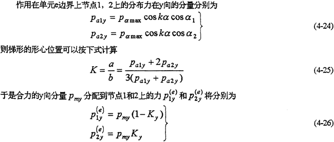 然后,按靜力學等效原理,將微段上的合力或其分量分別移置到對應的邊界各節(jié)點上。因邊界上各節(jié)點之間的微段一般較短,可認為各微段上的作用力近似梯形分布,而Pmx,Pmy就可以認為是作用在梯形的形心上(圖4-6(a))。