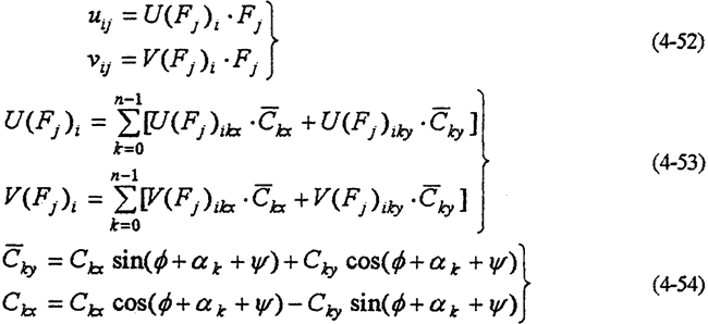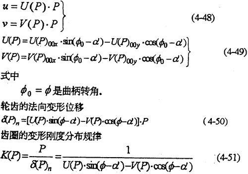 式(4-51)~(4-53)中U(Fj)ikx,U(Fj)iky,V(Fj)ikx,V(Fj)iky為行星齒板柔度系數(shù)的值,由磁盤(pán)文件提供計(jì)算。Ckx,Cky由式(4-30)及式(4-33)計(jì)算。