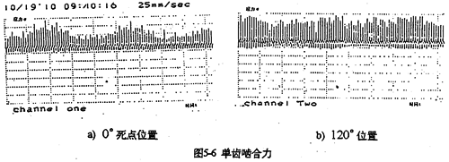 理想情況下,嚙合力的極小值在φ=0°、180°產(chǎn)生,極大值在φ=90°、270°產(chǎn)生,造成位置偏離的影響因素主要有軸承剛度,齒板剛度,嚙合角以及輸入轉(zhuǎn)速、傳動(dòng)比等等。其中軸承剛度的影響極大。在死點(diǎn)的嚙合力也產(chǎn)不并一定為零。哈合力可能為負(fù)值。為負(fù)值時(shí),將阻礙傳動(dòng)的正常轉(zhuǎn)動(dòng),產(chǎn)生內(nèi)齒輪副的干涉現(xiàn)象。并引起減速器沖擊振動(dòng)。因此,按照嚙合力過(guò)死點(diǎn)時(shí)為零的假設(shè)分布規(guī)律以及嚙合力為常數(shù)分布規(guī)律的模型分析,所得結(jié)果都是不可靠的。圖5-6是齒板死點(diǎn)位置180°及另一齒板位于超前120°嚙合點(diǎn)的單齒嚙合圖的測(cè)試結(jié)果。圖中每一棒線代表被測(cè)齒受?chē)Ш狭ψ饔靡淮巍1容^兩圖可知,死點(diǎn)位置嚙合力總體水平低于120°位置時(shí)的嚙合力總體水平,與理論分析計(jì)算的結(jié)果完全吻合。