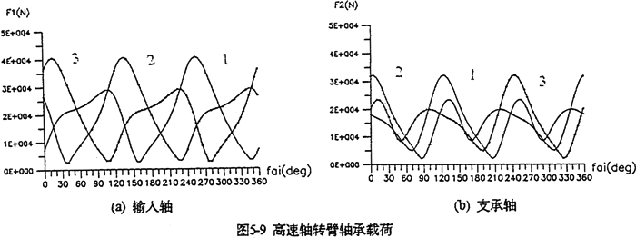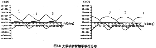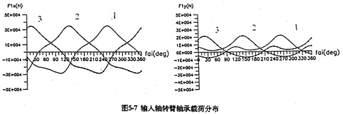 4.輸出軸的行星軸承總體載荷比支承軸行星軸承總體載荷大(圖5-9),特別是輸入軸X方向受力最大。輸入軸行星軸承載荷在死點(diǎn)附近取得最小值,在φ=105°、255°取得極大值。極大值產(chǎn)生的位置正好是機(jī)構(gòu)傳動(dòng)角最佳位置附近。在同一時(shí)刻,齒板上各輸入軸行星軸承的受力狀況是不是一樣的。當(dāng)某一齒板接近其死點(diǎn)位置時(shí),軸承載荷較小,而同時(shí)另外兩片遠(yuǎn)離死點(diǎn)位置的齒板上輸入軸行星軸承載荷要大得多。支承軸的軸承載荷在一個(gè)周期內(nèi)分別出現(xiàn)三次極大值和三次極小的值。由于這個(gè)原因使支承軸偏心套的微動(dòng)磨損比輸入軸偏心套的微動(dòng)磨損更為嚴(yán)重。行星軸承載荷的最大值為