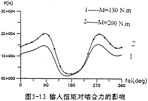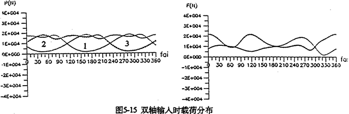 由上式可知,當減速器幾何參數(shù)一確定,e及r2均為已知參數(shù)。因此增大M,必須引起左邊的行星軸承載荷F(j)Lx,F(xiàn)(j)1y增大使方程式(5-30)平衡。圖5-13是輸入扭矩分別為150N.m及200N.m時的嚙合圖。由圖可看出,負載增加,嚙合力幅值增大。采用雙軸輸入時可降低各載荷的幅值,使其均衡化。圖5-14是單軸輸入時的嚙合力及行星軸承載荷。圖5-15是雙軸輸入時的嚙合力及行星軸承載荷。從兩圖比較得知,無論是嚙合力,還是軸承載荷,采用雙軸輸入后其變化均趨于平緩,幅值降低很多,三相嚙合力趨于均衡,而且負向嚙合力已消除。