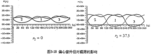 圖5-18是偏心套外徑對嚙合圖的影響。當不考慮偏心套外徑(r2=0)時,嚙合力分布為正值。考慮偏心套外徑(r2=37.5mm)計算結(jié)果,出現(xiàn)負向嚙合力。而且其幅值明顯增大。輸入扭矩也不再是固定值。因此,對三環(huán)減速器進行動力計算,必須考慮r2的影響。此外,行星軸承內(nèi)外圈接觸承載位置,也影響三環(huán)減速器的動力性能。