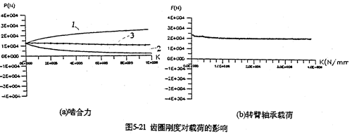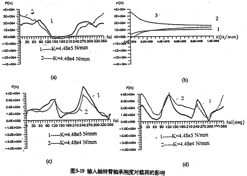 只考慮行星軸承變形及齒板變形時,影響三環(huán)減速器載荷特性的剛度,主要是行星軸承剛度、和內(nèi)齒圈的變形剛度。軸承剛度與軸承材料、間隙、油膜等很多因素有關(guān)。圖5-19是輸入軸行星軸承剛度對嚙合力及行星軸承載荷的影響。當輸入行星軸承剛度小一個數(shù)量級時,負向嚙合力區(qū)域增大(見圖5-19a);隨剛度減小、各相嚙合力越不均恒(圖5-19b),輸入軸行星軸承剛度的影響比輸入軸行星軸承剛度更大,見圖5-20所示。嚙合力及各行星軸承載荷在軸承剛度較小的情況時,都出現(xiàn)正常載荷的10倍以上的沖擊現(xiàn)象,沖擊產(chǎn)生的位置隨剛度變化不同。內(nèi)齒圈剛度對載荷的影響與行星軸承剛度相反(見圖5-21所錄)。當剛度越小時,三相齒板的嚙合力越均恒(見圖5-21a),而且行星軸承載荷幅值基本上不變(見圖5-21b)。同此可推知,減小三環(huán)減速器振動的途徑之一就是提高行星軸承剛度,減小內(nèi)齒圈剛度。這可以通過對行星軸承進行預(yù)緊,和采用軟齒面或大柔度齒圈的辦法,以使嚙合力和行星軸承載荷均衡化,以達到減振降噪的目的。