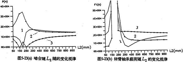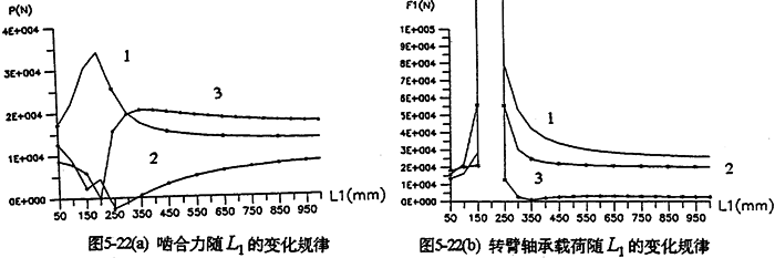 各軸水平布置時,軸間的中心距變化,將引起各載荷大小幅值、規(guī)律均發(fā)生變化。圖5-22是輸入軸相對輸出軸位置變化時,減速器的嚙合力及軸承載荷變化情況。由圖可知,當輸入軸與支承軸中心距(L2=200mm)很小時,三齒板的嚙合力分配很不均衡,隨著L1的增加嚙合力趨于均衡(見圖5-22a)。行星軸承載荷變化情況見圖5-22b所示。