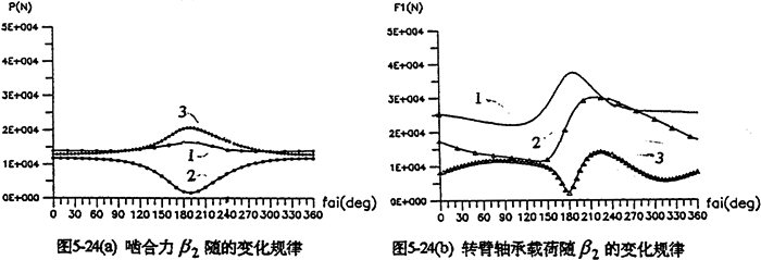 當輸入軸與軸出軸的中心距確定后,可通過調(diào)整支承軸的位置,滿足特殊的空間位置要求,或者設(shè)計成載荷分布特性最優(yōu)、幅值最小的減速器。圖5-24是中心距L1=400mm、L2=200mm時,支承軸相對于輸出軸轉(zhuǎn)動的角位移β2變化時嚙合力及行星軸承載荷的分布情況。由圖看出,各種載荷均在180°附近(SHQ偏置式減速器)取得極大值。在0°~90°和270°~360°范圍(Ⅰ、Ⅳ限內(nèi)),三相齒板嚙合力分配很均衡,嚙合沖擊很小。因此。設(shè)計三環(huán)減速器時,為減小載荷的幅值和各相之間載荷的差值、支承軸應(yīng)盡可能遠離180°,即不采用三軸心共線的水平位置的結(jié)構(gòu)。圖5-25為幾個特殊位置的嚙合力隨轉(zhuǎn)角變化的分布規(guī)律。